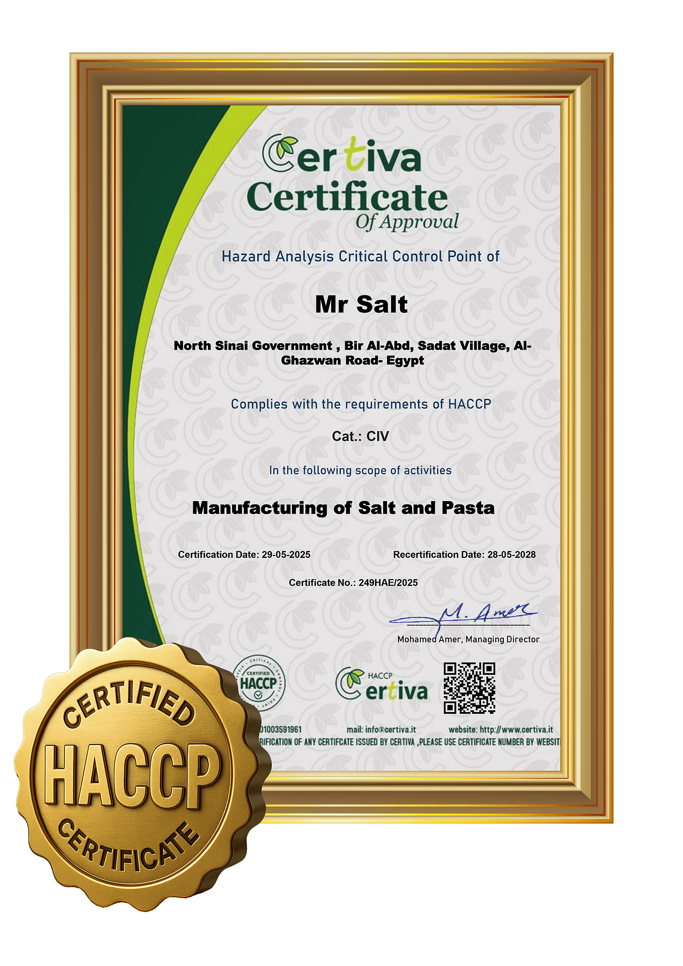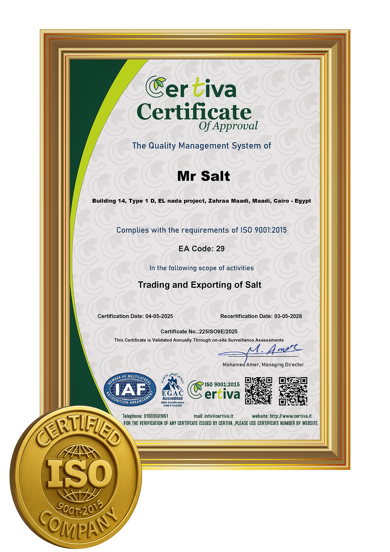 Basé au Caire, en Égypte, M. Salt exploite une installation de production ultramoderne dans le Nord-Sinaï. Notre mission est de fournir du sel égyptien de haute qualité aux marchés locaux et internationaux. Nous sommes fiers de respecter les normes internationales, avec des certifications telles que ISO 9001, HACCP et l’enregistrement auprès de la FDA. Notre engagement en faveur de l’excellence garantit que chaque produit, du sel brut au sel de table, répond à des processus rigoureux de contrôle de la qualité.