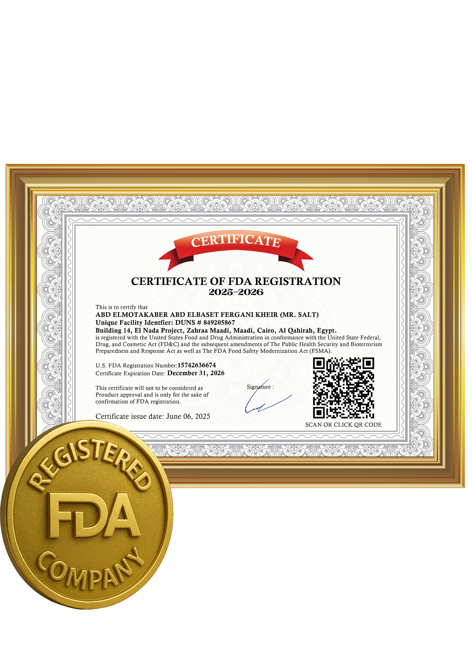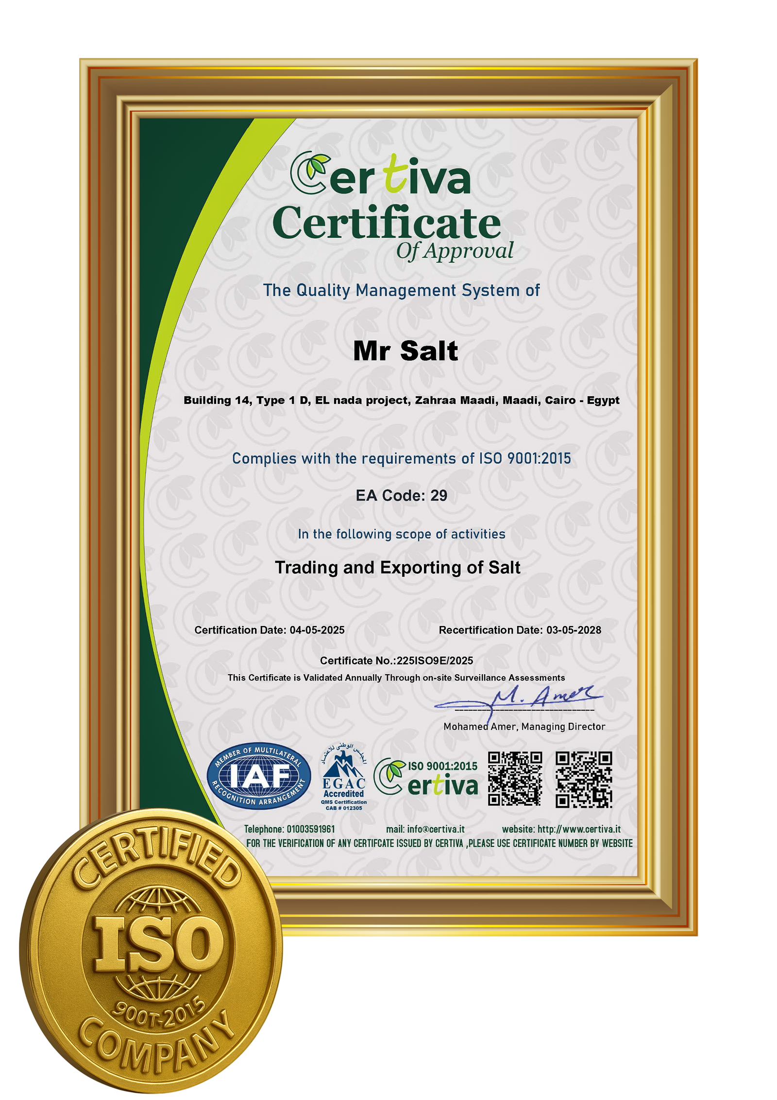Based in Cairo, Egypt, Mr. Salt operates a state-of-the-art production facility in North Sinai. Our mission is to supply high-quality Egyptian salt to both local and international markets. We pride ourselves on meeting international standards, with certifications including ISO 9001, HACCP, and FDA registration. Our commitment to excellence ensures that every product, from raw salt to table salt, meets stringent quality control processes.